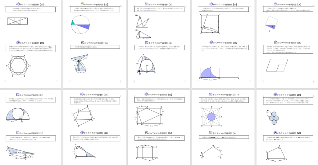 知らなかったら解けない・時間がかかる上、頻出度の高い問題ばかりを集めました。この40題を終えた後は、補助線の引き方や平面図形の解き方がワンランクupしていることでしょう。偏差値55~60以上の学校を志望している方にお勧めです♪